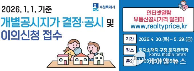 (케이엠뉴스) 수원시 영통구는 2026년 1월 1일 기준 개별공시지가를 4월 30일 결정·공시하고, 5월 29일까지 이의신청 기간을 운영한다.