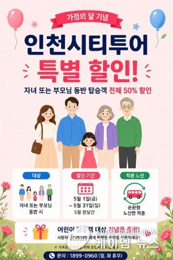 (케이엠뉴스) 인천관광공사는 5월 가정의 달을 맞아 가족 단위 관광객 유입을 확대하고 이용객의 재방문 활성화를 위한‘인천시티투어 특별 프로모션’을 실시한다고 밝혔다