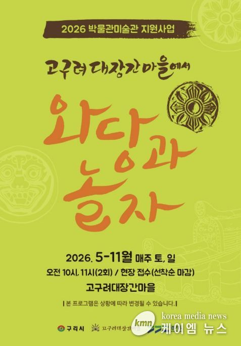 (케이엠뉴스) 구리시는 오는 5월 2일부터 11월 1일까지 매주 주말 고구려대장간마을에서 2026년 경기도 박물관·미술관 지원사업의 하나로 ‘고구려대장간마을에서 와당과 놀자’ 체험 행사를 운영한다고 밝혔다.