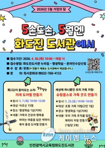 (케이엠뉴스) 인천광역시교육청화도진도서관은 5월 가정의 달을 맞아 유·초등생 동반 가족과 어르신을 대상으로 세대 맞춤형 프로그램 ‘5손도손, 5월엔 화도진도서관에서’를 운영한다.