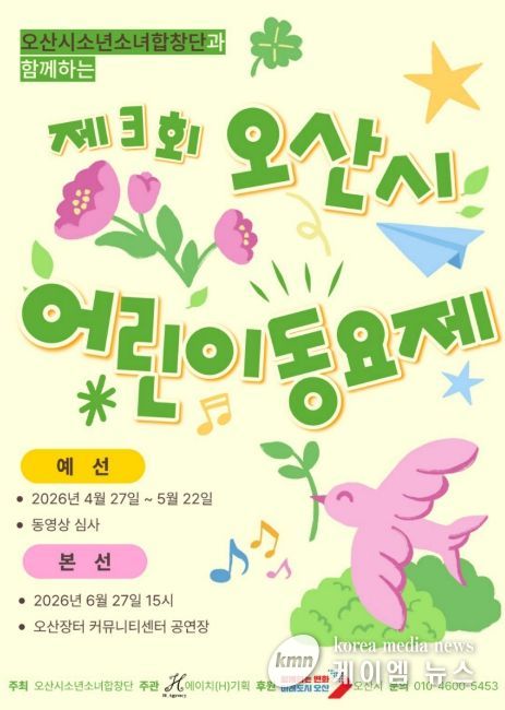 (케이엠뉴스) 오산시는 오산시소년소녀합창단이 오는 6월 27일 오산장터 커뮤니티센터 공연장에서 ‘제3회 오산시 어린이 동요제’를 개최한다고 밝혔다. 이번 행사는 사라져가는 동요를 널리 알리고, 어린이들에게 아름다운 우리말과 올바른 정서를 기를 수 있는 기회를 제공하기 위해 마련됐다.