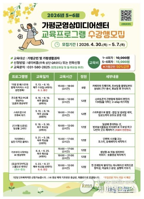 (케이엠뉴스) 가평군영상미디어센터가 군민들의 영상 미디어 콘텐츠 역량 강화를 위해 ‘5~6월 미디어 교육 프로그램’ 수강생을 4월 30일부터 선착순으로 모집한다.