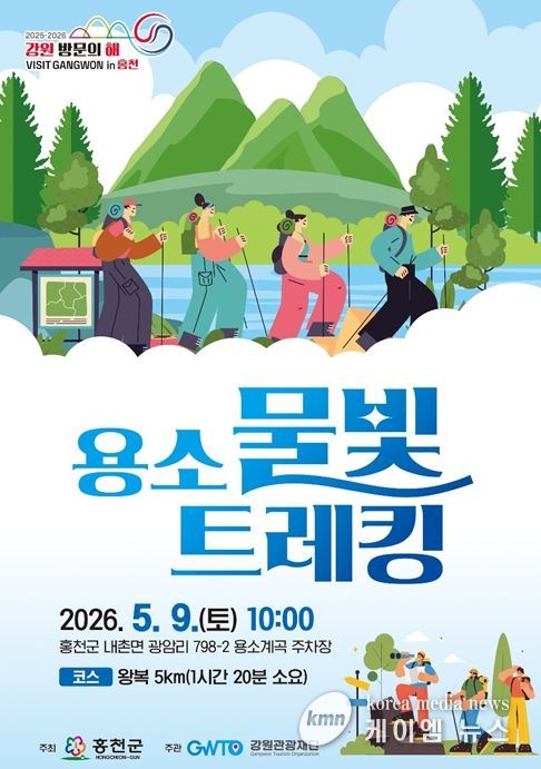 (케이엠뉴스) 강원관광재단은 홍천군과 함께 오는 5월 9일 오전 10시 홍천군 내촌면 용소계곡 일원(광암리 798-2)에서 ‘용소 물빛 트레킹’ 행사를 개최한다고 밝혔다.