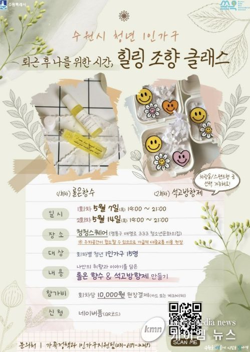 영통구에서는 청년 1인가구 비율이 높은 지역 특성을 반영해 정서 지원 중심 프로그램 ‘힐링 조향 클래스’를 운영한다. 5월 7일과 14일 청청스퀘어에서 열리며, 회차별 15명씩 총 30명이 참여할 수 있다.