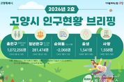 (케이엠뉴스) 고양특례시는 2026년 1분기 인구 변화를 분석한 '고양시 인구현황 브리핑(2026년 제2호)'를 제작·배포했다고 30일 밝혔다. 이 자료는 행정동 단위 인구 구조와 변화 추이를 종합적으로 분석해 데이터 기반 인구정책 수립을 위한 기초자료로 활용하고자 마련됐다. 2026년 3월 말 기준 등록 외국인을 포함한 고양시 총인구는 1,072,256명으로 전 분기 대비 소폭 감소했으나 107만 명대를 유지했다. 평균연령은 전 분기보다 0.2세 증가한 45.4세로 나타났다. 행정동별로는 풍산동이 신규 주택 입주 영향으로 2025년 3분기부터 지속적인 인구 증가세를 보이며 지난 분기에 이어 최다 인구를 기록했다. 장항1동과 삼송1·2동, 대화동은 청년층 비중이 높은 반면, 관산동과 고봉동은 고령층 비중이 상대적으로 높아 지역별 인구구조 차이가 뚜렷하게 나타났다. 또 2026년 1분기 출생아 수는 1,541명으로 전년 동기 대비 149명(10.7%) 증가한 것으로 나타났다. 행정안전부 주민등록 인구통계에 따르면 출생아 수는 지난해 같은 기간보다 뚜렷한 증가세를 보였으며, 인구 1천 명당 혼인건수를 의미하는 조혼