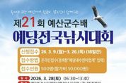 (케이엠뉴스) 예산군은 오는 3월 28일 예당전국낚시대회장에서 ‘제21회 예산군수배 예당전국낚시대회’를 개최한다고 밝혔다. 군에 따르면 예당전국낚시대회는 전국의 낚시 동호인과 관광객이 함께 어우러지는 민물낚시대회로 국민의 레저 수요를 충족하고 지역경제 활성화에도 기여할 것으로 기대된다. 참가 신청은 3월 9일부터 3월 26일까지 선착순 500명을 대상으로 접수한다. 대회 참가를 희망하는 사람은 예당내수면어업계 누리집을 통해 신청할 수 있으며, 참가비는 1인당 5만 원이다. 대회 시상은 1위 트로피와 상금 500만 원, 2위 200만 원, 3위 100만 원이 수여되며, 이와 함께 여자우수상, 최대어상, 외래어종 퇴치상, 최고령상, 원거리상 등 다양한 특별상이 마련된다. 또한 시상 외에도 추첨을 통해 참가자들에게 다양한 경품이 제공될 예정이다. 이 밖에도 참가자 전원에게 중식을 제공하며 광시한우 구이 시식코너 등 다양한 부대행사도 함께 운영할 계획이다. 군 관계자는 “출렁다리와 모노레일, 예당호를 배경으로 한 무빙보트 수상체험 등 다양한 볼거리와 체험거리가 마련돼 있다”며 “천