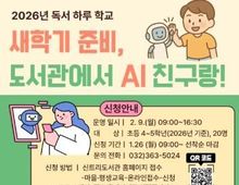 (케이엠뉴스) 인천광역시교육청신트리도서관은 관내 초등학생의 독서활동 기반 디지털 역량 향상을 위해 ‘새학기 준비, 도서관에서 AI 친구랑!’을 오는 2월 9일에 운영한다. 이번 프로그램은 예비 초등학교 4~5학년 학생을 대상으로 운영하며, 독서활동과 결합된 AI 체험을 통해 학생들의 디지털 역량과 새학기 적응력을 높이고자 마련했다. 주요 내용은 ‘AI로 배우는 똑똑한 학교생활’, ‘독서력 UP! 나만의 독서 친구’, ‘새학기 집중력 향상을 위한 요리 활동’, ‘AI 그림 놀이터’, ‘AI 창작 교실’ 등 AI 체험과 책 읽기를 접목한 창의·융합형 독서 활동으로 구성됐다. 모집은 신트리도서관 누리집에서 1월 26일부터 선착순으로 진행되며, 자세한 내용은 도서관 누리집을 참고하거나 어린이자료실로 문의하면 된다.