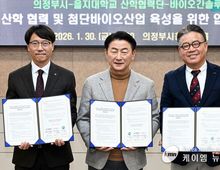 (케이엠뉴스) 의정부시가 경기북부 첨단 바이오산업의 메카로 거듭나기 위해 대학, 기업과 함께 강력한 지산학 협력 체계를 구축한다. 의정부시는 1월 30일 시청 회룡홀에서 을지대학교 산학협력단(단장 김인식), ㈜바이오간솔루션(대표 송명석)과 ‘지산학 협력 및 첨단 바이오산업 육성을 위한 업무협약’을 체결했다. 이번 협약은 관내 유치 기업인 ㈜바이오간솔루션의 안정적인 연구 공간 확보와 정착을 지원하고, 대학의 연구 인프라와 기업의 유전자 기반 원천기술을 결합해 의정부시를 글로벌 바이오산업 거점으로 조성하기 위해 마련됐다. 협약에 따라 세 기관은 ▲산학협력 기반 공동 연구과제 발굴 및 수행 ▲연구‧기술 교류를 통한 바이오산업 경쟁력 강화 ▲기업 투자 확대 및 사업 확장을 위한 행정적 지원 ▲기타 상호 발전을 위한 협력사항 등을 공동으로 추진하기로 했다. 또한, ▲시는 인프라 구축과 행정 지원을 맡고 ▲을지대학교 산학협력단은 실험 공간과 연구 장비의 공동 활용, 임상‧기초의학 기반 공동연구를 담당하며 ▲바이오간솔루션은 연구과제 발굴과 기술 상용화 등을 통해 지역사회 기여에 나선다. 시 관계자는