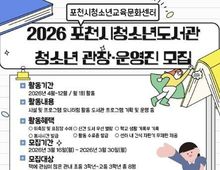 (케이엠뉴스) 포천시청소년재단 포천시청소년교육문화센터는 청소년 참여형 도서관 운영을 위해 ‘2026년 포천시청소년도서관 청소년 관장 및 운영진’을 모집한다. 청소년 관장과 운영진은 청소년의 시각에서 도서관 운영에 참여하고 다양한 독서·문화 프로그램을 기획하는 역할을 맡게 된다. 이를 통해 청소년이 도서관 활동에 주도적으로 참여하며 자기주도 역량과 리더십을 기를 수 있도록 지원할 계획이다. 활동 기간은 2026년 4월부터 12월까지로, 매월 1회 정기 활동을 실시한다. 참여 청소년에게는 위촉장과 활동 수료증이 발급되며, 봉사시간 인정, 학교생활기록부 기재, 신간 도서 우선 열람 등 다양한 혜택이 제공된다. 모집 대상은 관내 초등학교 3학년부터 고등학교 3학년까지 청소년 총 8명이며, 모집 기간은 3월 16일부터 3월 30일까지다. 네이버 폼을 통해 신청할 수 있으며, 심사를 거쳐 최종 대상자를 선발한다. 포천시청소년교육문화센터 관계자는 “청소년이 직접 도서관 운영에 참여하며 주체적으로 공간을 만들어가는 의미 있는 경험이 될 것”이라며 “독서와 문화 활동에 관심 있는 청소년들의 많은 참여를 바란다”고