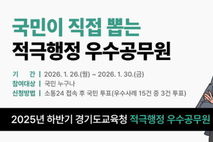 (케이엠뉴스) 경기도교육청이 공공의 이익을 높인 적극행정 우수공무원 선정을 위해 2025년도 하반기 대국민 심사를 실시한다. 도교육청은 창의적이고 능동적인 행정을 펼친 각 기관의 추천 사례를 접수해 1차 예선심사에서 우수사례 15건을 선정했다. 이를 대상으로 1월 26일부터 30일까지 ‘소통24’누리집에서 국민이 참여하는 온라인 투표 방식의 대국민 심사를 진행한다. 참여자는 1인당 3건의 우수사례에 투표할 수 있다. 본선 진출자는 예선심사 점수 60%와 국민투표 결과 40%를 합산해 최종 결정된다. 선발된 공무원에게는 교육감 표창과 포상금, 특별승급의 인사상 가점부여 등 다양한 특전을 제공할 계획이다. 이번 선발은 단순한 성과 평가를 넘어 적극행정의 모범사례를 널리 알리고, 공직사회 전반에 적극행정 문화를 확산시키는 의미가 있다. 특히 국민이 직접 우수공무원을 선정함으로써 정책 수요자의 관점이 반영된다는 점에서 공정하고 투명한 심사 절차가 마련될 것으로 기대된다. 도교육청은 앞으로도 국민이 체감하는 변화를 만들어낸 공무원의 노력을 널리 알리고, 적극행정을 일상적 공직문화로