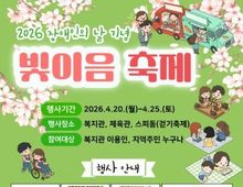 (케이엠뉴스) 광명장애인종합복지관은 장애인의 날을 맞아 오는 4월 20일부터 25일까지 ‘2026 장애인의 날 기념 주간행사 – 빛이음 축제’를 개최한다. 이번 행사는 광명시가 주최하고 광명장애인종합복지관이 주관하여, 장애에 대한 올바른 이해를 확산하고 지역사회 내 포용 문화를 조성하기 위해 마련됐다. 행사는 광명장애인종합복지관, 체육관, 광명스피돔 및 목감천 일대에서 진행되며, 이용인과 가족, 자원봉사자, 지역주민 등 누구나 참여할 수 있다. 주요 프로그램으로는 ▲SNS 장애인식개선 캠페인(사전) ▲AI 그림책 출판기념회(월) ▲푸드트럭 운영(화) ▲사랑의 짜장 나눔(화) ▲제4회 프리티 축제(목) ▲목감천 걷기축제(금) ▲체험부스 및 먹거리(금) ▲가족 장기자랑(금) ▲광장복 어워즈(금) 등이 마련되어 있다. 특히, 국제로타리3690지구 광명로타리클럽과 함께하는 ‘제4회 프리티 축제’는 지역사회 협력의 대표 프로그램으로, 다양한 커피 체험과 나눔이 어우러진 참여형 행사로 운영된다. AI 그림책 출판기념회에서는 참여자들이 창작한 전자책 34권을 선보이며, 작가로서의 경험을 공유하는 시간을 통해 장애에 대한