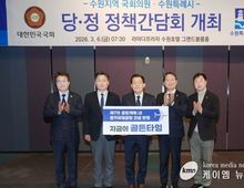 (케이엠뉴스) 이재준 수원특례시장은 6일 라마다프라자 수원호텔에서 열린 지역 국회의원들과 당·정 정책간담회에서 “제7차 공항개발 종합계획에 ‘경기국제공항’ 건설 내용이 반영될 수 있도록, 경기도와 협의해 달라”고 요청했다. 이날 정책간담회에는 이재준 시장과 김영진(수원시병)·김승원(수원시갑)·염태영(수원시무)·김준혁(수원시정) 의원, 김현수 제1부시장, 수원특례시의회 김정렬 부의장 등이 참석했다. 참석자들은 수원시 주요 추진 사업을 공유하고, 협력을 강화하기로 했다. 수원시와 지역 국회의원들은 분기에 1회 정기적으로 정책간담회를 열고 있다.