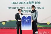 (케이엠뉴스) 김포시는 17일 솔터실내테니스장에서 대한민국 테니스 스타 정현 선수의 김포시청 직장운동경기부 테니스팀 입단을 기념하고, 데이비스컵 2라운드 진출을 축하하는 행사를 개최했다. 이날 행사에는 김병수 김포시장을 비롯해 임청수 김포시체육회장, 박헌규 김포시테니스협회장과 테니스 관계자 및 동호인 등이 참석해 자리를 빛냈다. 행사는 시민과 동호인을 대상으로 한 팬 사인회를 시작으로 정현 선수의 주요 활약상을 담은 영상 상영, 기념 퍼포먼스, 입단 소감 및 축사 순으로 진행됐다. 특히 이날 행사에서는 정현 선수가 최근 데이비스컵 경기에서 실제 착용한 유니폼을 기념 액자로 제작해 김병수 시장에게 전달하는 의미 있는 시간이 마련됐다. 해당 유니폼은 국가대표 경기 특성상 소속팀 마크를 부착할 수 없음에도 불구하고, 정현 선수가 김포시청 입단을 기념하고 김포시를 알리기 위해 대한테니스협회에 요청해 특별히 김포시청 마크를 부착하고 출전한 것으로 알려져 의미를 더했다. 이어 김병수 시장은 정현 선수에게 꽃다발을 전달하고, 정현 선수의 유니폼에 김포시청 마크를 부착하는 퍼포먼스를 통해 김포시청 선수로서의 새로