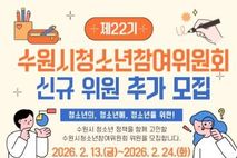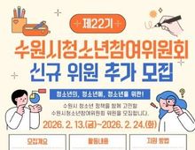 (케이엠뉴스) 수원시청소년청년재단(이사장 최종진)은 수원시 청소년의 정책 참여 확대와 권익 증진을 위해 '제22기 수원시청소년참여위원회' 위원을 추가 모집한다고 밝혔다. 수원시청소년참여위원회는 청소년기본법5조의2(청소년자치권의 확대)에 따라 청소년이 직접 정책 제안과 의견 개진에 참여하며 청소년 정책의 실효성을 높이기 위해 운영되는 공식 참여기구이다. 이번 추가 모집은 수원시에 거주하는 9세부터 24세까지의 청소년을 대상으로 하며 총 20명 내외를 선발할 예정이다. 활동 기간은 2026년 3월부터 12월까지이며 주요 활동 내용은 △수원시 청소년 정책 제안‧발굴 및 자문 △정책 관련 전문교육 참여 △청소년축제 기획 및 운영 △경기도 청소년참여위원회 및 관내 참여기구 교류 활동 등이다. 참여위원회 위원에게는 수원시장 명의의 위촉장이 수여되며 활동에 따라 봉사시간도 부여된다. 모집 기간은 2026년 2월 13일부터 2월 24일까지이며 신청은 재단 홈페이지 또는 수원시청소년청년재단 경영지원실로 문의하면 된다.