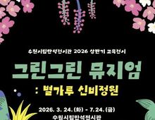 (케이엠뉴스) 경기도 수원시립미술관은 자연과의 관계를 성찰하고 생태적 가치를 체험하는 참여형 교육전시 《그린그린 뮤지엄 : 별가루 신비정원》을 3월 24일부터 7월 24일까지 수원시립만석전시관에서 개최한다. 《그린그린 뮤지엄》은‘자연과의 눈맞춤’을 주제로 자연의 초록(Green) 빛을 예술로 그려낸다(Drawing)는 중의적 의미를 담아 연간으로 운영된다. 2026년 상ㆍ하반기 두 차례에 걸쳐 운영되며, 상반기 1부 전시는《그린그린 뮤지엄: 별가루 신비정원》에 이어 하반기에는 새로운 주제의 2부 전시가 이어질 예정이다. 이번 전시는 회화 작가 진영(b.1982)과 설치, 사운드 등 융복합 작업을 선보이는 팀 아르테코(est.2023, 설혜린, 이소희, 김창수, 드림스케이프)가 참여한다. 전시는 총 20점의 작품으로 구성되며, 두 개의 섹션을 통해 자연을 감각하고 사유하는 경험을 제공한다. 첫 번째 섹션 '어두운 밤, 숲의 이야기'는 앵무새를 매개로 숲의 서사를 그려내는 작가 진영의 작품을 소개한다. 클로드 모네의 '수련이 있는 연'을 오마주한 작업 '사이 02'(2024)는 도시 속 유일한 쉼의 공간인 공원이라