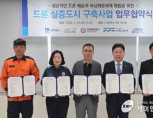 (케이엠뉴스) 수원특례시, 수원도시재단, 수원영통경찰서, 수원소방서, ㈜드론스쿨인터네셔널은 24일 더함파크에서 ‘드론 실증도시 구축 사업’ 추진을 위한 업무협약을 체결하고, 협력을 약속했다. 협약에 따라 각 기관은 ▲드론 실증도시 구축을 위한 협력체계 마련 ▲드론 배송 서비스 운영·기술 실증 ▲드론 비행 안전관리·시민 안전 확보 ▲사고 대응 모의훈련, 비상 대응체계 구축 ▲사업 홍보·성과 확산 등에 협력한다. 수원시는 사업을 총괄하고, 행정 지원을 한다. 수원도시재단은 인프라 구축과 운영 지원을 담당하고, 수원영통경찰서와 수원소방서는 드론 비행 안전관리와 사고 대응에 협력한다. ㈜드론스쿨인터네셔널은 드론 배송 운영과 플랫폼 구축 등 사업화를 추진한다. 수원시가 국토교통부 주관 ‘2026년드론실증도시 구축사업’ 공모에 선정돼 진행하는 ‘하늘 편의점과 함께하는 광교산책길 드론배송 서비스’ 실증사업과 연계해 추진한다. 광교호수공원과 광교저수지 일원에 드론 이착륙장 등 거점 2곳과 배달점 8곳을 설치하고, 시민이 모바일로 주문한 식음료와 비상 물품을 드론으로 배송할 계획이다. 이날 협약식에는 오민범 수원시