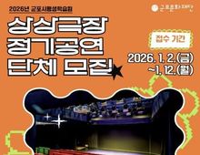(케이엠뉴스) 군포문화재단 군포시평생학습원 상상극장은 2026년 정기공연 무대를 함께 만들어갈 공연단체 10팀을 최종 선정했다. 선정된 공연단체들은 오는 3월부터 본격적인 공연을 선보이며 유아부터 가족까지 함께 즐길 수 있는 작품들로 한 해 동안 상상극장 무대에서 시민들과 만난다. 이번 정기공연에는 인형극, 뮤지컬, 연극 등 다양한 장르의 작품들로 구성되어 있으며 전래동화를 바탕으로 한 이야기부터 고전문학에서 착안한 작품, 환경을 주제로 한 공연, 우리 문화적 요소를 담은 공연까지 폭넓은 내용으로 구성됐다. 상상극장 정기공연의 가장 큰 매력은 소극장 공간에서 배우와 가까이서 만날 수 있다는 점이다. 무대와 객석의 거리가 가까워 아이들이 공연에 더욱 집중하고 몰입할 수 있는 환경을 제공하며 관객과 배우가 함께 호흡하는 생생한 관람을 가능하게 한다. 군포문화재단 전형주 대표이사는 “상상극장 정기공연은 시민의 일상 속에 공연예술이 스며드는 하나의 과정”이라고 말하며 “한 해 동안 펼쳐질 무대들로 상상극장만의 색깔을 꾸준히 만들어가고자 한다”라고 전했다. 상상극장 정기공연의 세부 공연 일정과 작품 정보는