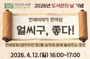 (케이엠뉴스) 김포시 마산도서관은 제4회 도서관의 날을 맞아 오는 4월 12일 오후 4시부터 5시까지 마산도서관 3층 다목적실에서 전래이야기 한마당 '얼씨구, 좋다!'를 운영한다. 4월 12일은 '도서관법'에 따라 도서관에 대한 국민의 이해와 관심을 높이고 이용을 촉진하기 위해 지정된 ‘도서관의 날’이다. 시는 이를 기념해 가족 단위의 관람객이 즐길 수 있는 공연을 마련했다. 공연은 밴드 ‘판’이 진행하며, 건반과 베이스, 기타, 장구 등 다양한 악기를 활용해 전래동화를 음악으로 재구성한 무대다. 혹부리 영감, 별주부전 등 친숙한 이야기를 노래와 연주로 풀어내며, 옛 동요와 국악 장단을 활용한 창작곡도 함께 선보일 예정이다. 이번 공연은 김포시민 100명을 대상으로 하며, 3월 24일 오전 10시부터 김포시 통합예약 홈페이지를 통해 신청할 수 있다.