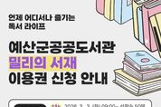 (케이엠뉴스) 예산군 공공도서관은 지역주민의 디지털 독서 접근성을 높이고 생활 속 독서문화 확산을 위해 ‘구독형 전자책 지원 사업’을 운영한다. 최근 디지털 콘텐츠 이용이 늘면서 시간과 장소 제약 없이 독서를 즐길 수 있는 비대면 독서 서비스 수요가 증가하고 있으며, 이에 군은 전자책 이용 기회를 확대하고 함께 읽고 나누는 독서공동체 문화를 확산하기 위해 이번 사업을 마련했다. 사업은 3월부터 12월까지 운영되며, 군 공공도서관 정회원(도서관 카드 발급 회원)을 대상으로 구독형 전자책 서비스 이용권을 차수별로 배부한다. 이용자는 PC와 모바일 기기를 통해 최신 베스트셀러와 자기계발서, 아동·청소년 도서, 오디오북 등 다양한 콘텐츠를 언제 어디서나 이용할 수 있다. 이용권은 차수별 선착순 50명에게 배부하며, 1인당 1매로 3개월간 사용이 가능하다. 1차 접수는 3월 3일 오전 9시부터 시작하며 도서관 누리집 행사참가신청 메뉴에서 신청하면 된다. 군 관계자는 “구독형 전자책 서비스를 통해 주민 누구나 부담 없이 독서를 접하는 계기가 되길 바란다”며 “앞으로도 전자책 서비스와