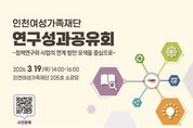 (케이엠뉴스) 인천여성가족재단은 오는 3월 19일 2층 소강당에서 연구성과공유회를 개최한다. 이번 연구성과공유회에서는 재단에서 지난 1년 동안 수행한 연구성과를 시민과 전문가, 관계기관 담당자들과 함께 나누며, 변화하는 사회환경에 발맞춰 향후 인천시 여성가족정책의 방향을 모색하고 연구와 사업의 환류 강화을 위한 자리로 마련된 행사이다. 이번 공유회는 2025년 연구과제에 관한 총괄적인 발표에 이어 재단에서 수행한 연구과제 중 사업 운영과 직접 관련되어 수행된 여성사회교육기관 운영 개선 관련 연구와 아이사랑꿈터 운영 개선 연구가 세부 발표로 기획됐다. 연구결과가 실제 여성정책 사업의 운영과 개선에 어떻게 더 실효성 있게 반영될 수 있을지를 관계자들이 모여서 함께 토론하기 위한 자리이다. 인천여성가족재단은 여성문화회관을 운영하고 있고 아이사랑꿈터 운영지원단을 비롯하여 여성의 사회참여와 돌봄지원을 위한 다양한 사업을 운영하고 있다. 연구과제가 실질적인 인천시의 여성가족 정책사업의 운영 개선으로 확장되고 환류되기 위한 과제가 무엇인지 짚어보고 이를 위해 필요한 관계자들의 소통 증진을 위한 자리로 마련된 것이다. &nb