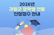 (케이엠뉴스) 가평군이 지역 학생들의 균등한 교육 기회를 보장하고 우수 인재를 육성하기 위해 2026년도 장학생 선발에 나선다. 군은 올해 중학생 17명, 고등학생 76명, 대학생 107명 등 총 200명을 장학생으로 선발할 계획이다. 장학금은 학생들의 다양한 상황과 역량을 고려해 △으뜸 △특기 △복지 △환경 △보금자리 등 5개 분야로 나눠 선발한다. 신청 자격은 공고일(3월 3일) 기준 가평군에 3년 이상 거주한 군민 또는 그 자녀인 중‧고등학생과 대학생이다. 신청을 희망하는 학생은 공고문을 참고해 5개 분야 가운데 하나를 선택한 뒤 신청서와 관련 구비서류를 준비해 거주지 관할 읍면사무소에 제출하면 된다. 접수 기간은 3월 4일부터 26일 오후 6시까지다. 자세한 사항은 가평군청 홈페이지 고시공고를 통해 확인할 수 있다.